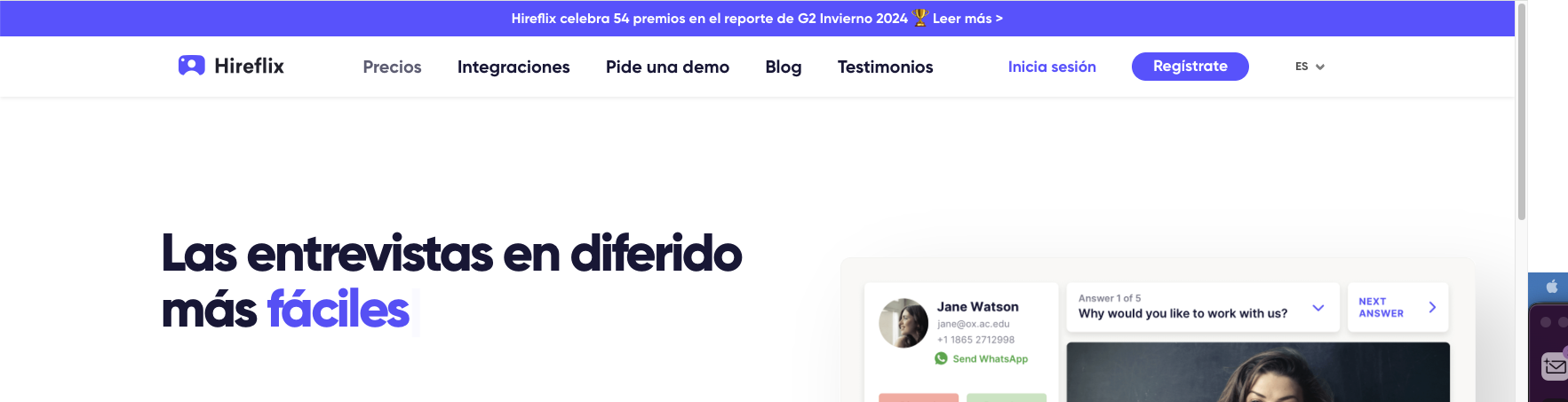 Otro ejemplo es este de Hireflix, que deja un lugar muy prominente de su home para mostrar los premios de G2 que ha recibido.
