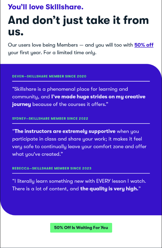Los testimonios son descripciones más detalladas sobre cómo los usuarios utilizan la herramienta. Son muy útiles para conseguir autoridad y, si se realizan bien, pueden ser herramientas de marketing muy interesante.